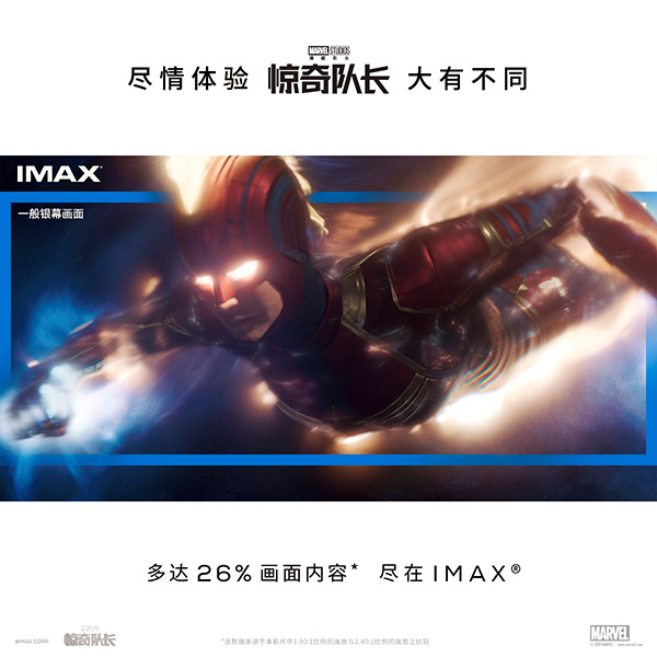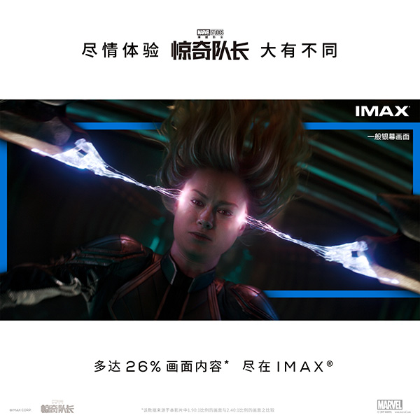 像许多漫威影片一样,此次IMAX3D版《惊奇队长》部分画面有着多达26%的震撼画面增幅,和一般银幕相比,在IMAX大银幕上,部分精选的场景画面会上下延展,扩展至1.9:1的全画幅比例,这意味着观众将看到多达26%的精彩画面内容,惊奇队长强大酷炫的超能力和浩瀚壮阔的星际世界,都将以更加饱满的姿态呈现,太空大战的场面更是炫酷无比,在IMAX“顶天立地”的超大银幕及完美的数字音效系统加持下,观众将能身临其境地尽情体验到IMAX 3D版《惊奇队长》的“大有不同”。