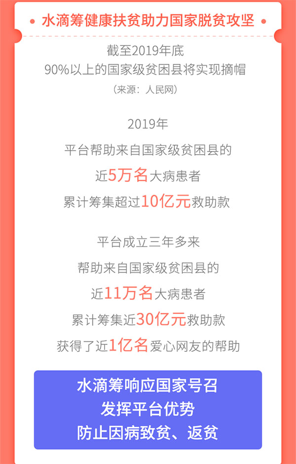 水滴筹平台还响应国家号召,发挥平台优势防止因病致贫、返贫,2019年平台助推来自国家级贫困县的近5万名大病患者,累计筹集超过10亿元救助款。